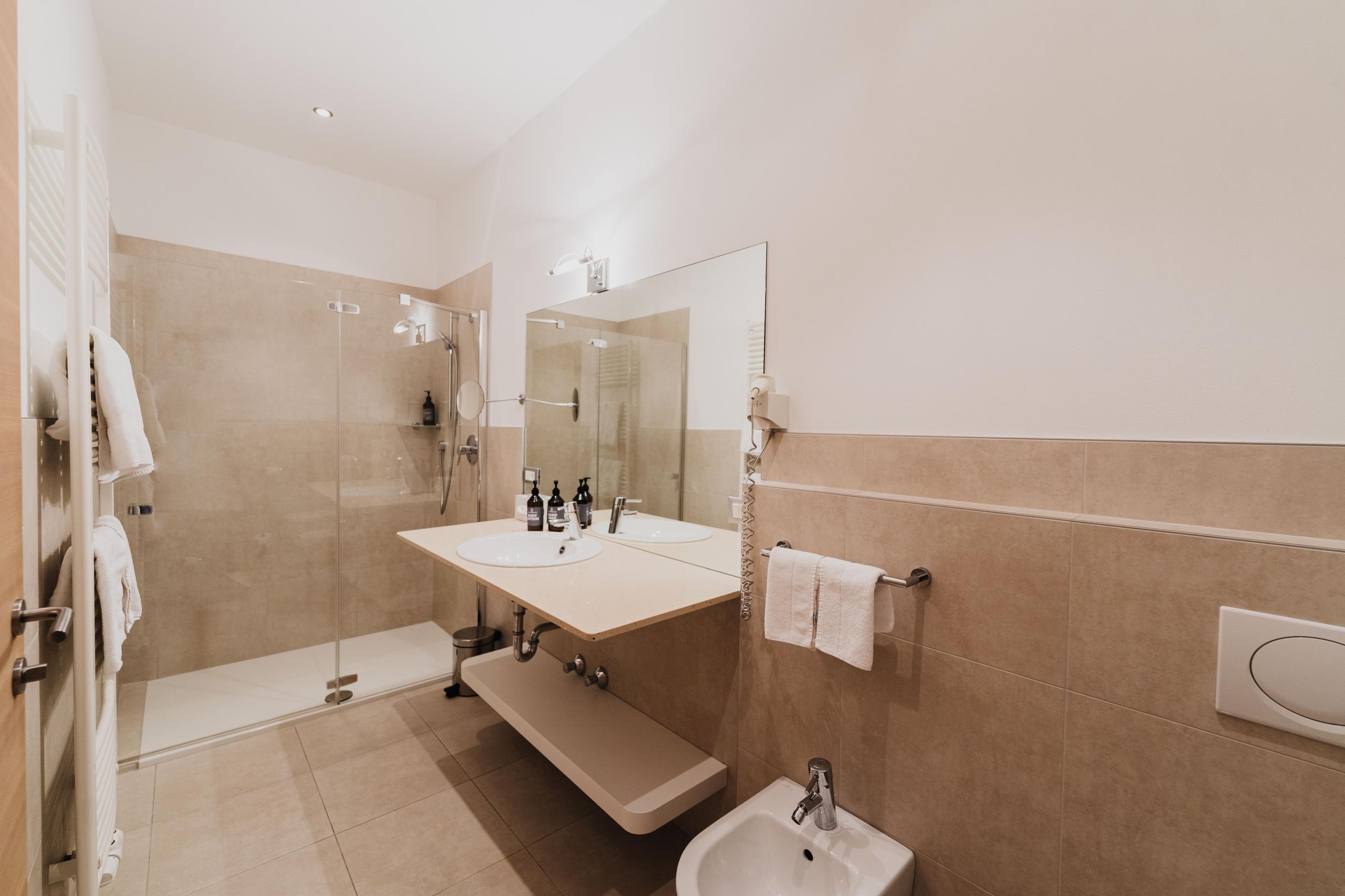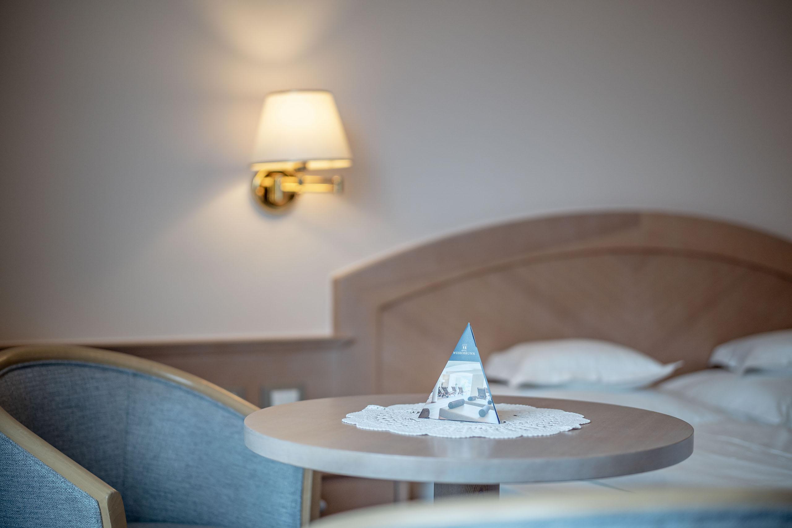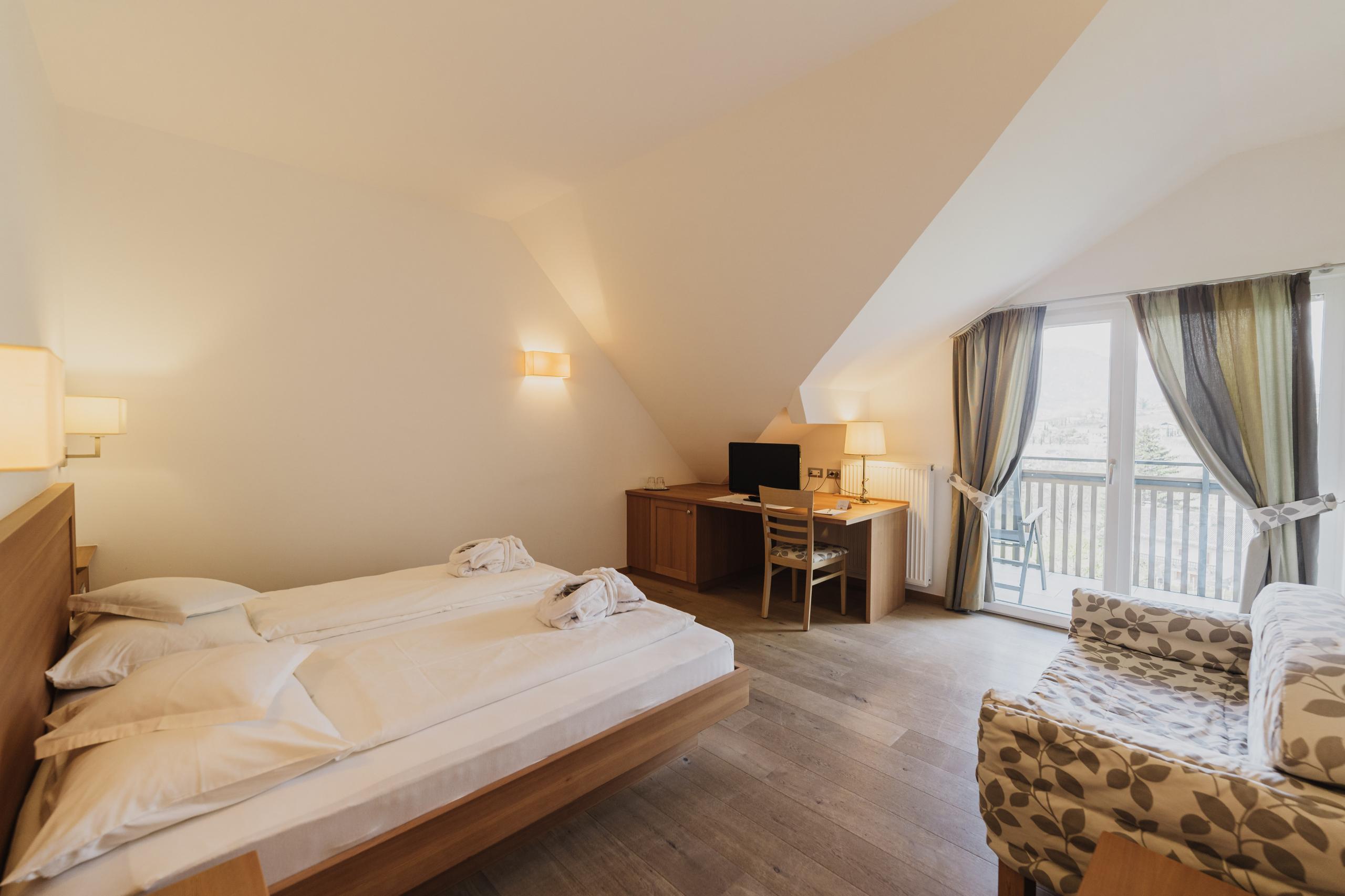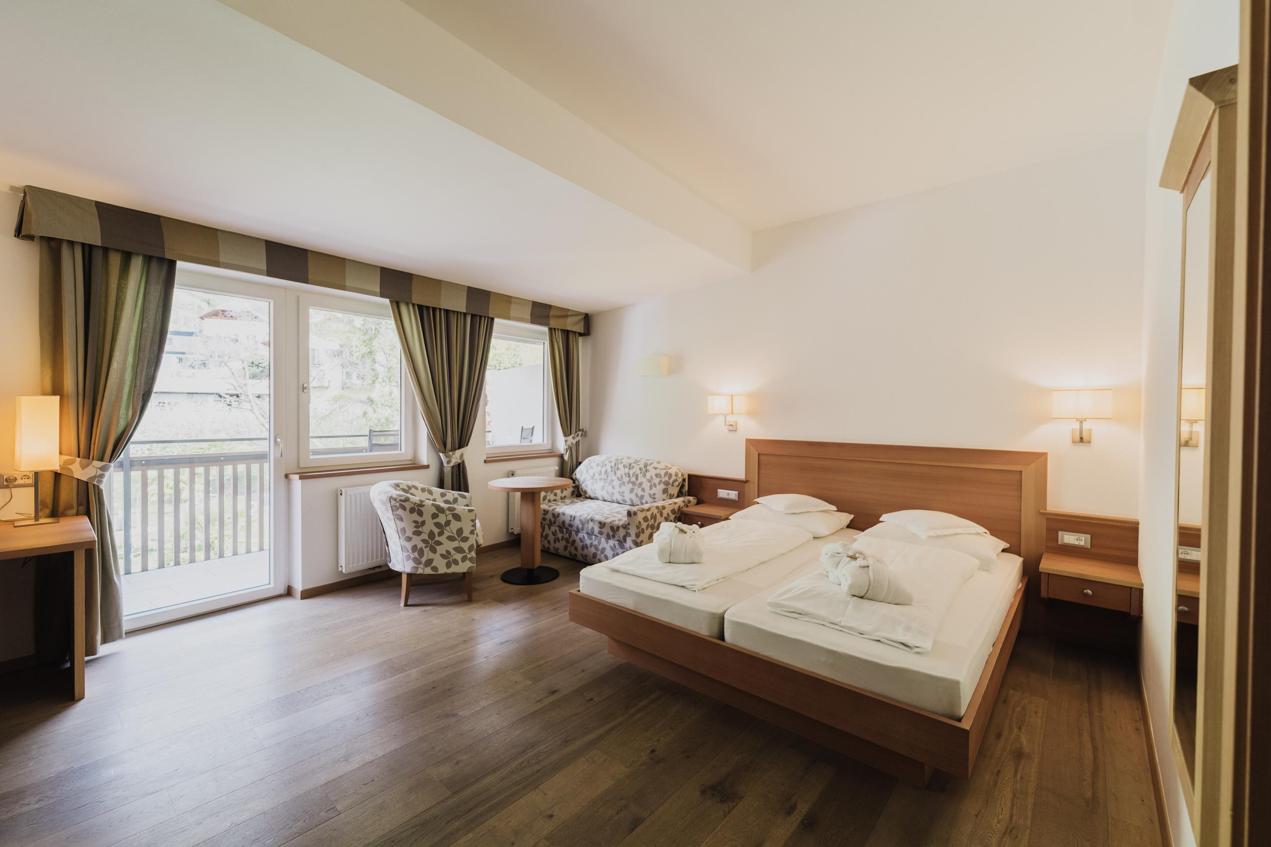 Double room with lounge, wooden floor, bath or shower, WC, hair dryer, satellite TV, minibar, phone, safe, ready-furnished balcony, W-Lan, air conditioning.